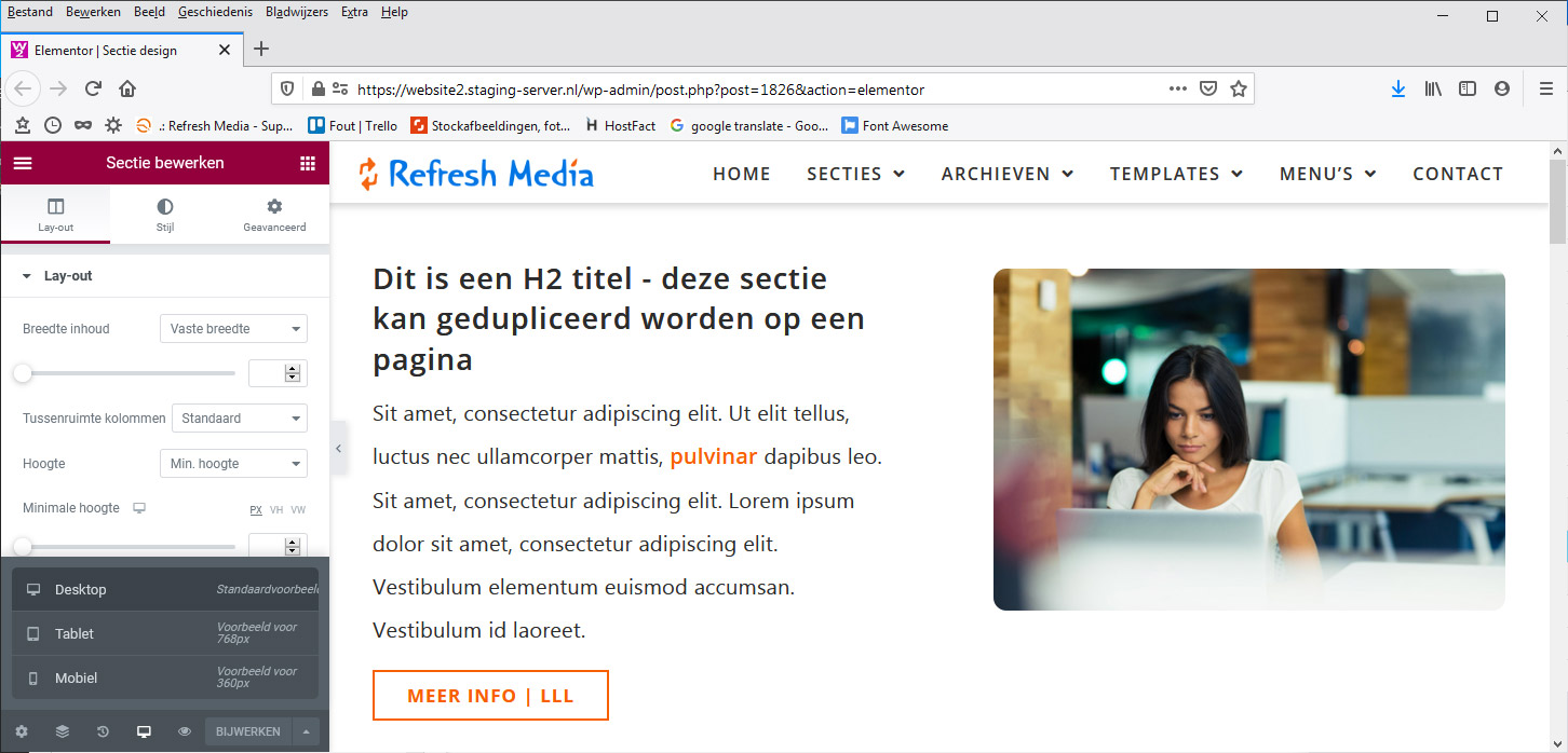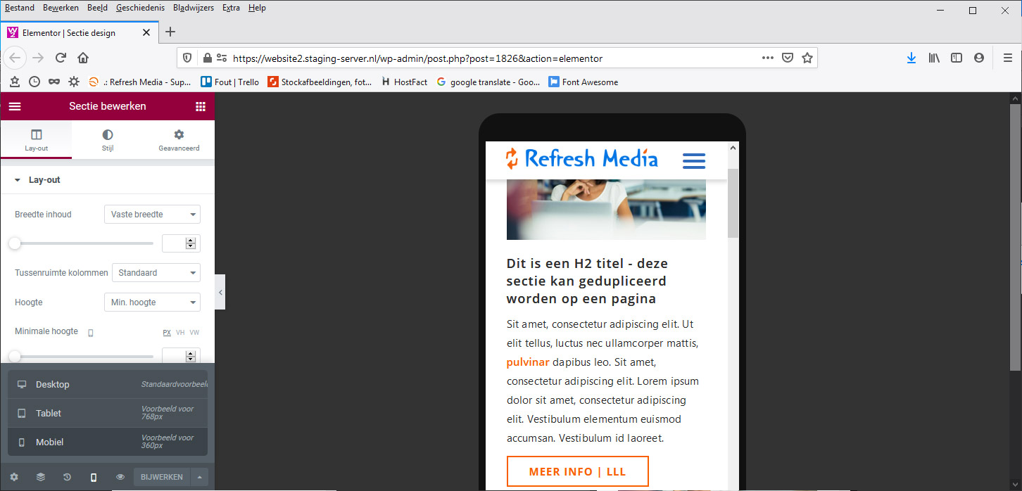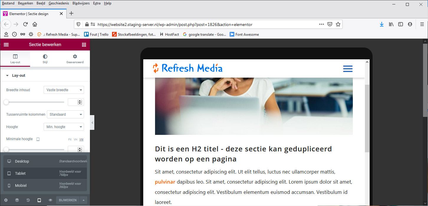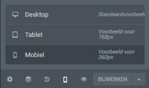 Linksonderin staan een aantal iconen afgebeeld. Via het beeldscherm-icoon is het mogelijk om te bekijken hoe de website er op verschillende schermen uitziet. Het is mogelijk om te bekijken hoe de website er uit ziet op Desktop, Tablet en Mobiel.