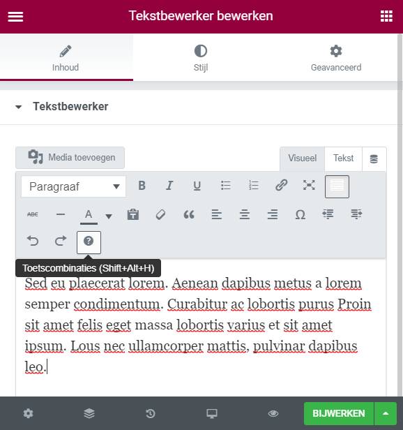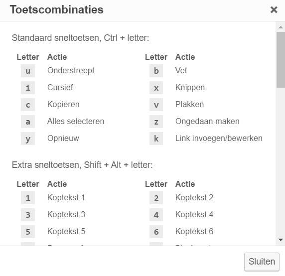 De toetscombinaties geven de sneltoetsen weer. Klik op “Toetscombinaties” om alle opties in beeld te laten verschijnen. Het is een handige tool om sneller te werken.