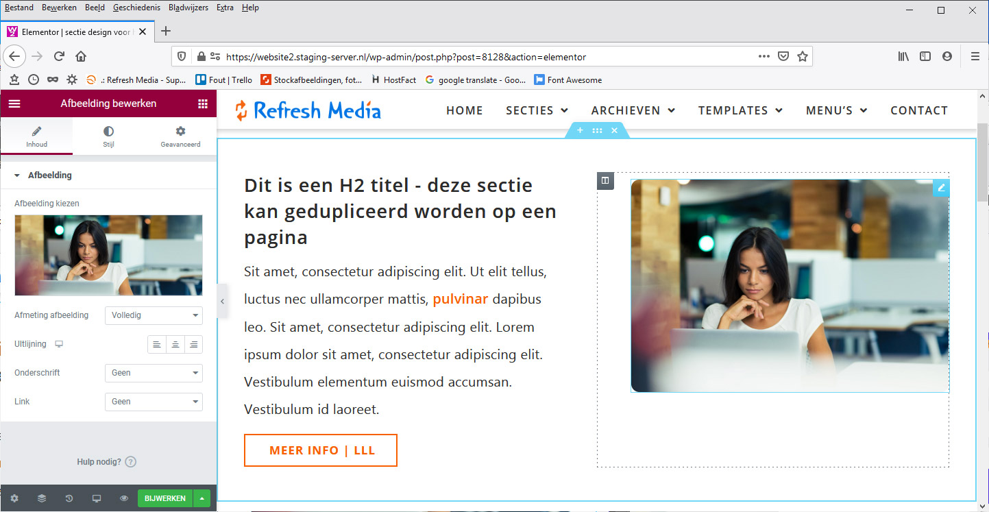 Aan de linkerkant wordt de afbeelding getoond bij de tab INHOUD. Klik op de afbeelding om een andere afbeelding te kiezen in de Media Bibliotheek.