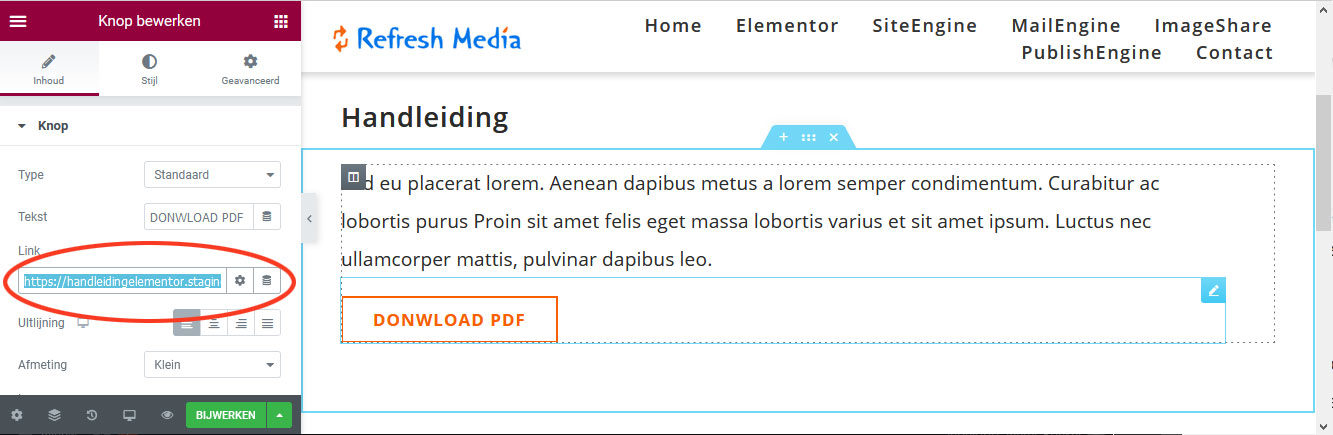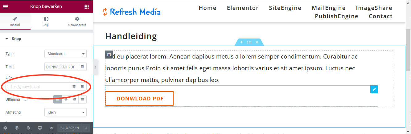 Na het kopiëren van de URL kan deze worden geplaatst in de LINK van het element, bijvoorbeeld een button of een tekst link.