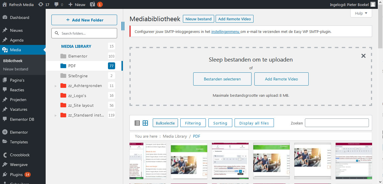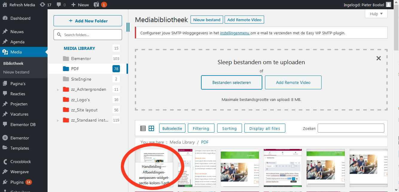 Selecteer MEDIA aan de linkerkant in het menu. Onderstaand scherm verschijnt. Kies de juiste map in de Media Library waarin de PDF geplaatst moet worden.