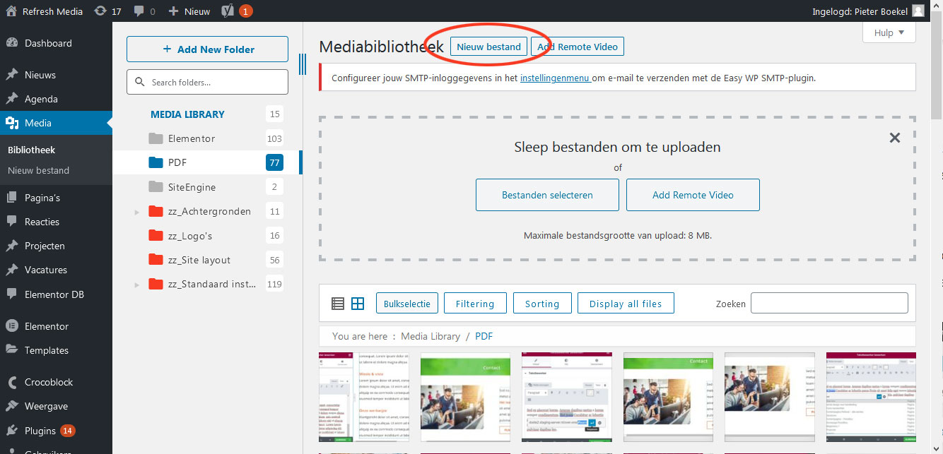Klik bovenin op de knop NIEUW BESTAND en kies een pdf vanaf de lokale computer om deze te uploaden naar de server in de juiste map. Deze 2 stappen kunnen sneller door te kiezen in het menu aan de linkerkant: MEDIA > NIEUW BESTAND