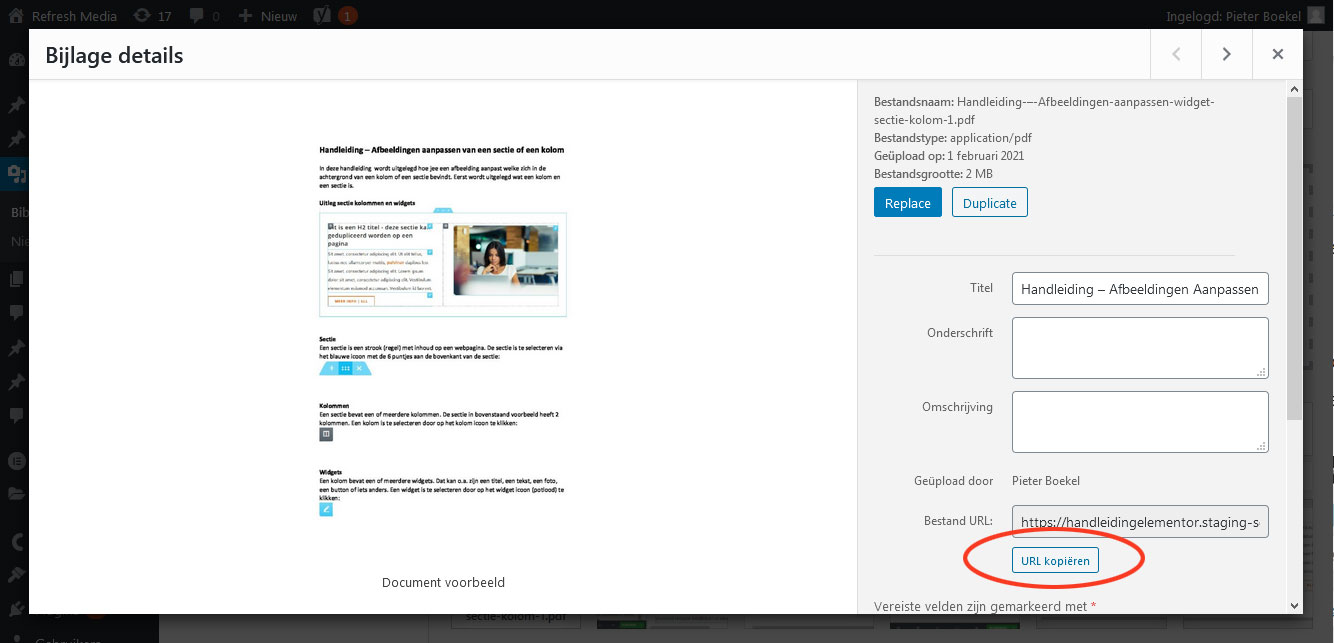 Na het klikken op het bestand opent onderstaande pagina. Dit zijn de details van het zojuist geüploade bestand. Om de link naar het bestand mee te kunnen geven als link is de URL vereist. Deze kan worden gekopieerd door de klikken op URL KOPIEREN.