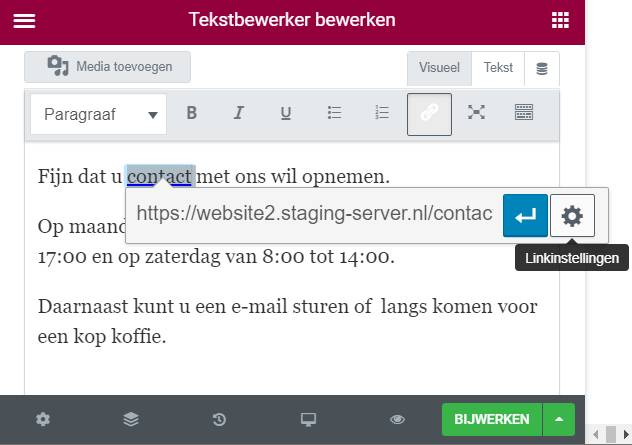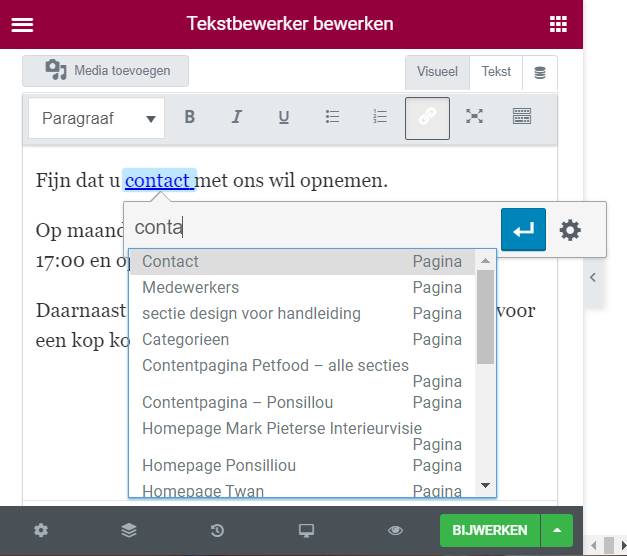Klik op de gewenste pagina (contact). Klik op blauwe icoontje om link werkend te maken.
