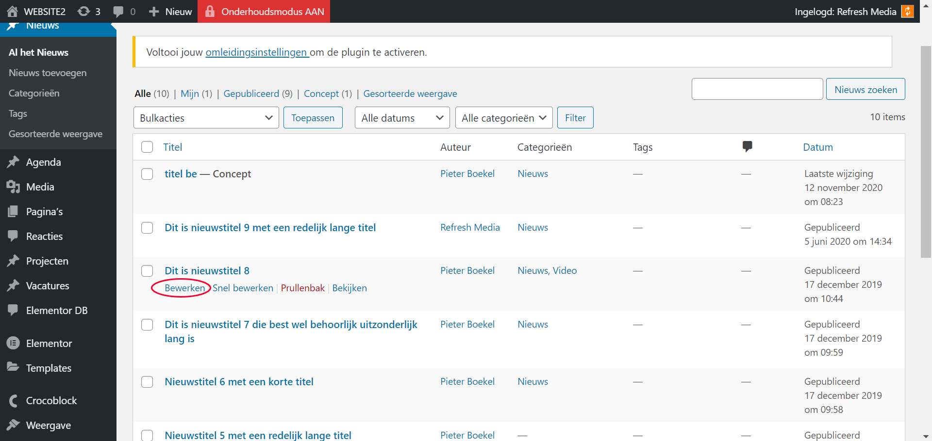Hover over het bericht dat aangepast moet worden. onder de titel komen opties tevoorschijn. Klik op BEWERKEN
