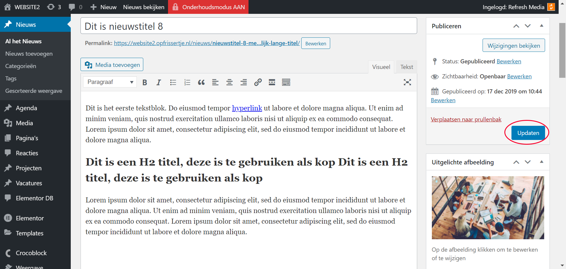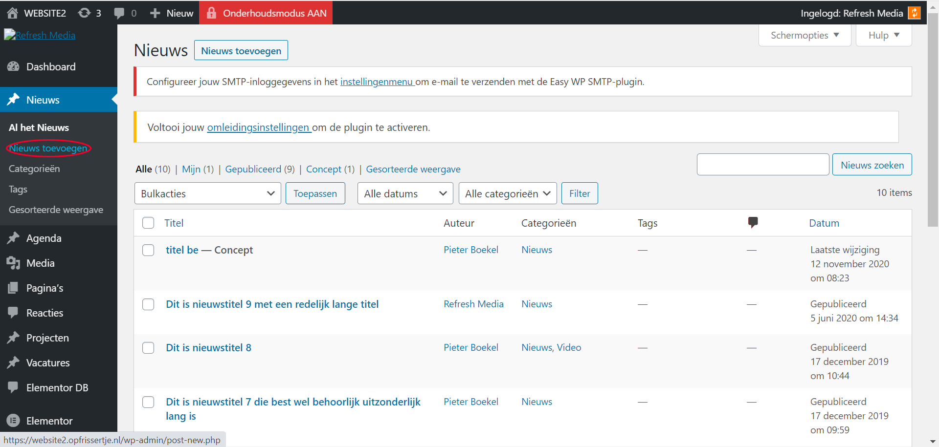 Klik op nieuws toevoegen om een nieuw bericht aan te maken.