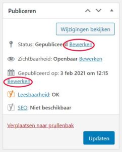 Om een bericht in te plannen klik je op BEWERKEN op de regel met het kalender icoon. Hier kan de publicatie datum worden aangepast.