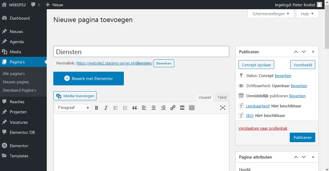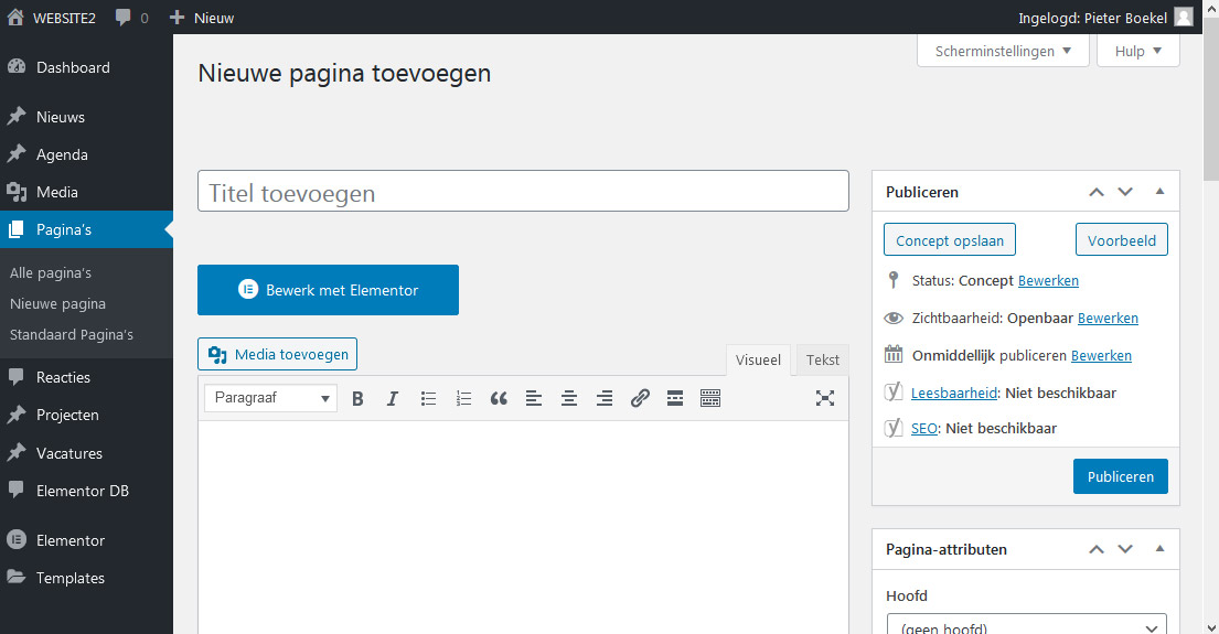 Klik in bovenstaand scherm op de blauwe knop: ‘Bewerk met Elementor‘. Daarna is de nieuwe blanco pagina is aangemaakt maar nog niet gepubliceerd.