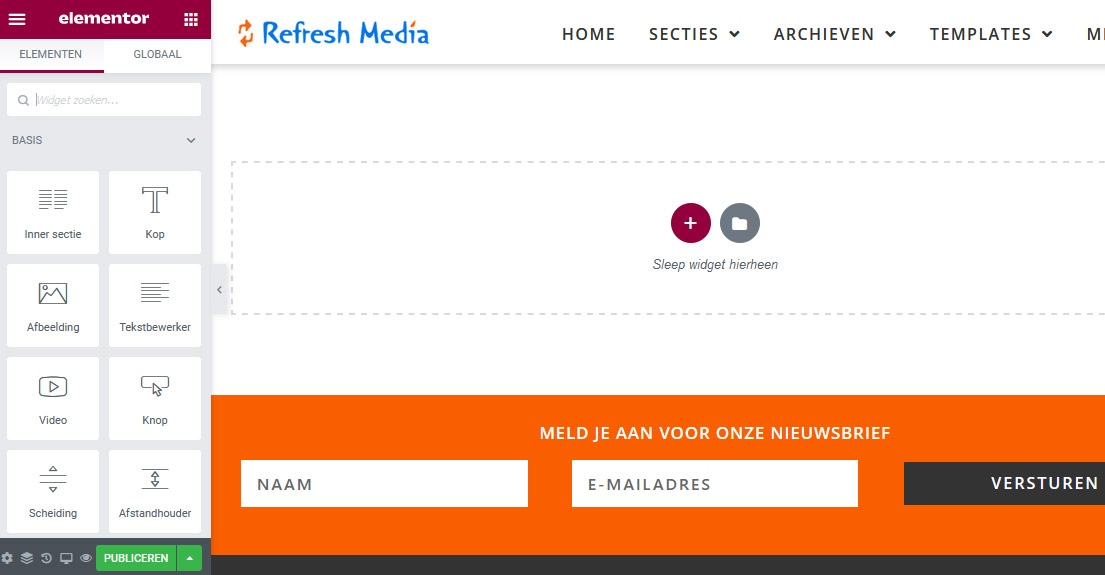 Het is mogelijk om nieuwe pagina op te bouwen met nieuwe secties, kolommen en widgets. Hiervoor is veel kennis nodig van Elementor. Sneller is om ervoor te kiezen door secties van andere pagina’s te kopiëren en te plakken in deze pagina.Bekijk hiervoor de instructie: Secties kopiëren en plakken.