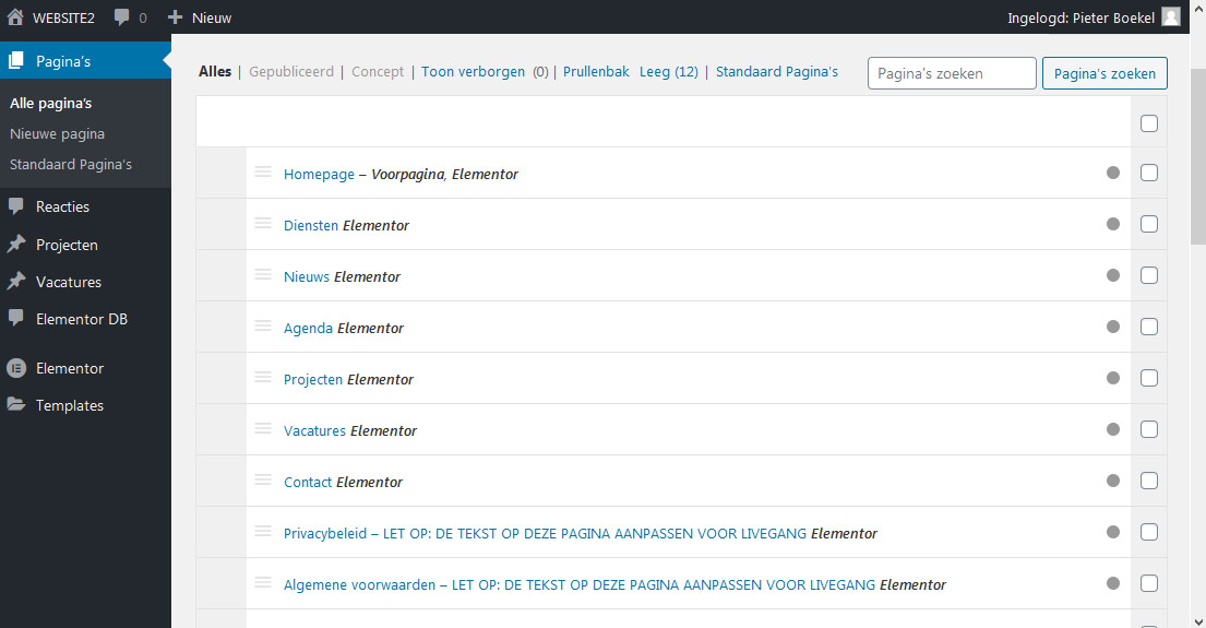 Via Pagina’s > Alle pagina’s is aangemaakte pagina terug te vinden (Diensten in dit voorbeeld):
