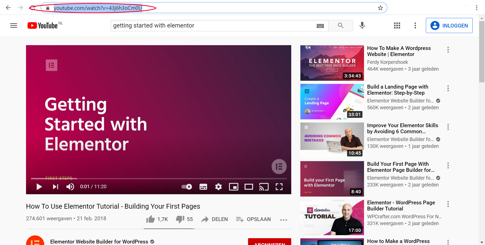 Open de YouTube video die op de site gezet moet worden en kopieer de link die in de Adresbalk staat